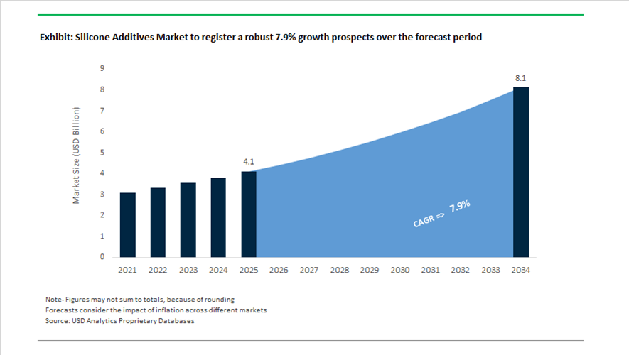 The global silicone additives market is valued at $4.1 billion in 2025 and is projected to reach $8.1 billion by 2034, expanding at a CAGR of 7.9%. Growth is driven by PFAS replacement, high-performance coatings, EV battery applications, and demand for advanced polymer processing aids across multiple industries.