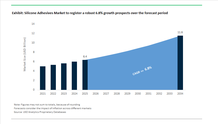 The Global Silicone Adhesives Market is projected to grow from $6.4 billion in 2025 to $11.6 billion by 2034, exhibiting a compound annual growth rate (CAGR) of 6.8%. This steady expansion is driven by the increasing use of high-performance silicone bonding systems across industries that demand durability, flexibility, dielectric strength, and extreme temperature stability — from electric vehicles (EVs) and aerospace propulsion systems to semiconductor protection and medical device assembly.