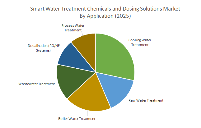 Cooling water treatment holds the largest share in the smart water treatment chemicals and dosing solutions market, accounting for approximately 28.4% of total demand in 2025. This dominance stems from the extensive deployment of industrial cooling towers across sectors such as power generation, petrochemicals, and manufacturing where automated dosing systems ensure optimal control of scale, corrosion, and biofouling. Smart dosing platforms powered by real-time sensors and AI algorithms are reducing chemical consumption and extending equipment life by precisely adjusting chemical feed rates based on process conditions. In contrast, desalination is the fastest-growing application segment, projected to expand at a 15.2% CAGR through 2034. This growth is driven by the rapid adoption of reverse osmosis (RO) and nanofiltration (NF) systems in water-scarce regions and the rising integration of AI-driven platforms for predictive antiscalant and biocide dosing. Wastewater treatment is also experiencing strong growth, with smart nutrient dosing and biological process optimization supporting a 13% CAGR as municipalities and industries embrace precision control for regulatory compliance and cost savings. Boiler water, process water, and raw water treatment continue to integrate digital dosing to enhance efficiency and reduce manual intervention, particularly in decentralized and remote facilities.