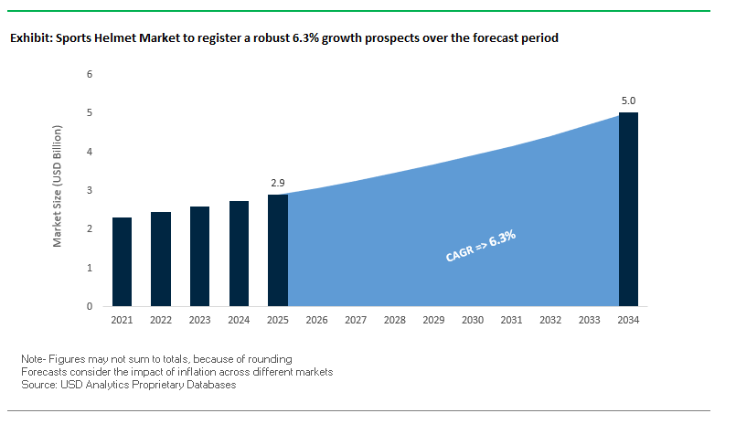 The global sports helmet market is expected to grow from $2.9 billion in 2025 to $5 billion in 2034 with a steady CAGR of 6.3%. The market is growing at a rapid rate due to the safety of players being the priority of professional, amateur, and recreational players. As there is growing awareness of concussions worldwide and tougher safety regulations being enforced by sporting bodies, manufacturers are creating helmets with innovative materials, enhanced impact protection systems, and integrated technology.