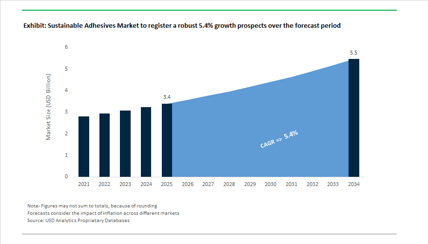The Global Sustainable Adhesives Market is expected to expand from USD 3.4 billion in 2025 to USD 5.5 billion by 2034, advancing at a 5.4% CAGR, as sustainability shifts from a compliance topic to a core product-design and procurement criterion. What distinguishes this market is not volume substitution alone, but a structural re-engineering of adhesive chemistry, sourcing, and manufacturing footprints in response to Scope 1–3 emission targets, product carbon footprint disclosure, and tightening VOC and hazardous-substance regulations across major end markets.