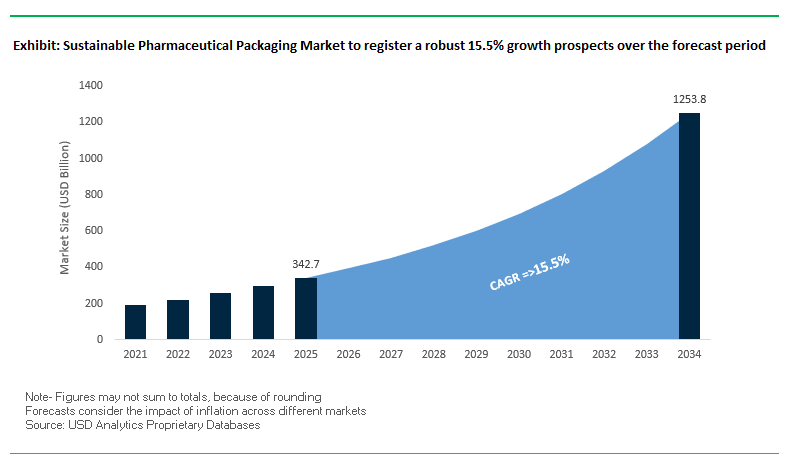 The global sustainable pharmaceutical packaging market is expected to grow from $342.7 billion in 2025 to $1,253.6 billion by 2034, registering a CAGR of 15.5%. Growth is driven by regulatory mandates, corporate sustainability commitments, and increasing adoption of recyclable, reusable, and bio-based packaging in pharmaceuticals and nutraceuticals.