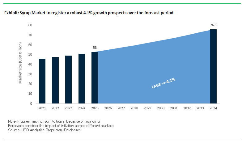 The global syrup market is projected to grow from USD 53 billion in 2025 to USD 76.1 billion by 2034, registering a CAGR of 4.1%. Growth is driven by rising demand for natural, health-focused, and functional syrups across beverages, bakery, and confectionery segments. This expansion reflects both flavor innovation and regulatory-driven sugar reduction initiatives.