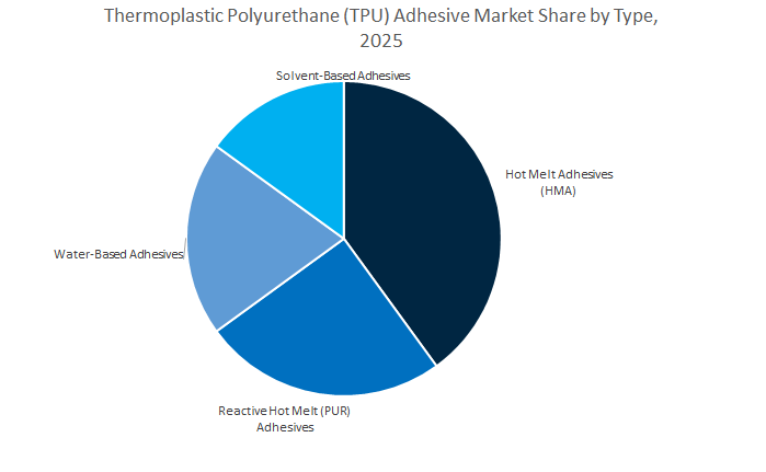 The Hot Melt Adhesives (HMA) segment holds the largest share of the global TPU adhesive market, accounting for an estimated 44.6% of total demand in 2025. This dominance stems from their superior process efficiency, rapid curing capability, and environmental compliance, making them the preferred choice across automated manufacturing lines in sectors such as packaging, footwear, and electronics. As a 100% solids system, TPU-based hot melts eliminate volatile organic compounds (VOCs), aligning with global sustainability goals and stringent environmental regulations. Their strong initial tack and thermal stability make them particularly suited for bonding thermoplastic materials, composites, and textiles, offering a clean and reliable alternative to solvent-based systems. Meanwhile, Reactive Hot Melt (PUR) Adhesives are experiencing robust growth due to their dual advantages of high structural strength and chemical resistance, combining the processing benefits of standard HMAs with enhanced durability post-curing. These are increasingly used in automotive assembly, electronics encapsulation, and furniture manufacturing, where long-term mechanical performance and resistance to temperature extremes are critical. Water-Based TPU Adhesives also maintain a strong market position as industries shift toward low-odor, non-toxic, and environmentally friendly bonding solutions, particularly in footwear, packaging, and consumer goods applications. Conversely, Solvent-Based Adhesives continue to decline in global share as sustainability and worker safety take precedence; however, they retain importance in specialized industrial applications requiring rapid drying and high adhesion to low-energy substrates.
