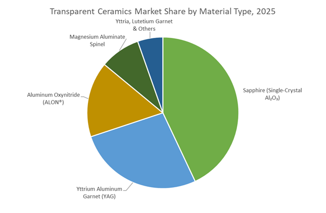 Sapphire accounts for approximately 40% of the transparent ceramics market because it occupies a performance tier that no other transparent material can economically displace in 2025. Its dominance is not driven by optical clarity alone, but by a non-substitutable combination of hardness, thermal stability, and mechanical rigidity that directly aligns with high-value industrial and defense use cases. With a Mohs hardness of 9 and a Young’s modulus of 420 GPa, sapphire delivers six times the stiffness of standard glass, enabling its use in semiconductor carrier plates and optical windows where even micron-level deformation would compromise yield or signal accuracy. The ability to maintain structural integrity and transparency up to 2,040°C positions sapphire as the default choice for high-temperature furnaces, propulsion systems, and IR-transparent viewports, eliminating lifecycle replacement costs associated with glass or polycrystalline ceramics. Critically, 2025 manufacturing scale-ups—where sapphire boules now reach 83–200 kg via Kyropoulos and EFG methods—have shifted sapphire from a niche optics material to a large-format, commercially viable solution for surveillance windows and multi-spectral sensor domes up to 30 inches. When AR-coated, sapphire achieves 98% transmission across visible and mid-IR bands, making it indispensable for multi-sensor fusion systems used in harsh, obscured environments. These structural and optical advantages translate directly into lower failure risk, longer service life, and higher system uptime—explaining why sapphire continues to command the largest share despite higher upfront material costs.