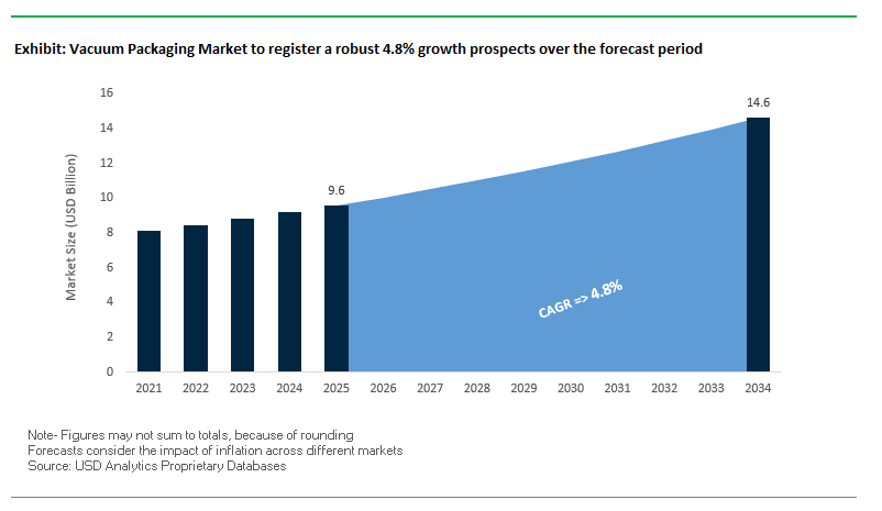 The global vacuum packaging market is projected to grow from USD 9.6 billion in 2025 to USD 14.6 billion by 2034, registering a CAGR of 4.8%. Growth is driven by rising demand for shelf-life extension, food safety, automation, smart packaging technologies, and sustainable solutions across food, pharmaceutical, and industrial applications.