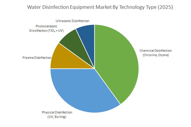 Chemical disinfection remains the largest segment in 2025, accounting for roughly 40.3% of the global water disinfection equipment market. Technologies such as chlorination, chloramination, ozone, and chlorine dioxide dominate municipal water treatment due to their cost-effectiveness, proven pathogen control, and ability to maintain residual disinfectant in distribution networks. Physical disinfection (35.6%), particularly UV disinfection, is rapidly growing as a chemical-free alternative, valued for broad-spectrum pathogen inactivation, including chlorine-resistant organisms like Cryptosporidium, and compact deployment in residential, wastewater reuse, and food & beverage applications. Emerging disinfection technologies, including plasma, photocatalytic (TiO₂ + UV), and ultrasonic systems, cater to niche or industrial segments requiring high-efficiency, compact, or multi-barrier pathogen control.