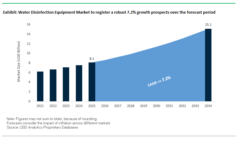 The global water disinfection equipment market is projected to grow from USD 8.1 billion in 2025 to USD 15.1 billion by 2034, registering a CAGR of 7.2%. The growth is driven by a strong push toward chemical-free water disinfection technology, increasingly stringent regulatory frameworks, and a surge in water reuse initiatives to combat scarcity. The market is benefiting from a rapid shift toward UV disinfection, ozonation, and advanced oxidation processes (AOPs), which are favored for their ability to inactivate pathogens without generating harmful disinfection byproducts (DBPs) such as trihalomethanes (THMs).
