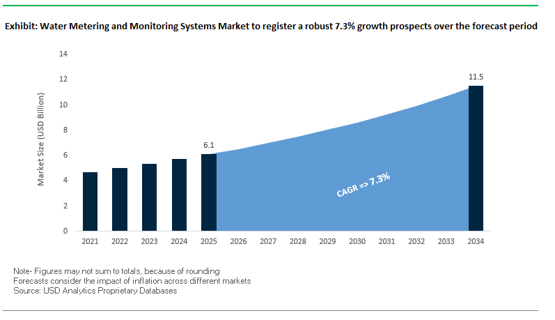 The global water metering and monitoring systems market is projected to grow from $6.1 billion in 2025 to $11.5 billion by 2034, registering a CAGR of 7.3%. This growth is fueled by the urgent need to reduce non-revenue water (NRW), replace aging infrastructure, and integrate advanced digital solutions into water networks. Utilities and municipalities are increasingly turning to smart metering and monitoring technologies to optimize operational efficiency, detect leaks proactively, and ensure sustainable water management.