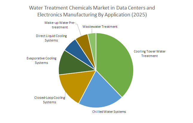 Cooling tower water treatment is the leading application segment, representing approximately 37.8% of market share in 2025. These systems, widely used in both large-scale data centers and electronics manufacturing facilities, require consistent chemical treatment to control microbial growth, scale deposition, and corrosion in high-volume recirculating water systems. As data centers scale up their cooling infrastructure to support power-dense servers, cooling towers remain central to facility operations. However, direct liquid cooling (DLC) systems are emerging as the fastest-growing application, projected to expand at a 12.9% CAGR through 2034. This growth is being driven by the adoption of immersion and cold plate cooling technologies in AI and high-performance computing (HPC) data centers, where precise temperature control and water purity are critical. DLC systems require highly specialized chemical formulations that maintain thermal fluid quality and prevent scaling within microchannel surfaces. Closed-loop and chilled water systems also contribute significantly to chemical demand, particularly for long-life corrosion inhibitors and low-residue dispersants that support uptime and thermal stability. Make-up water pre-treatment and wastewater treatment remain support functions, with the former ensuring feedwater quality and the latter addressing compliance and sustainability goals in high-throughput manufacturing environments.